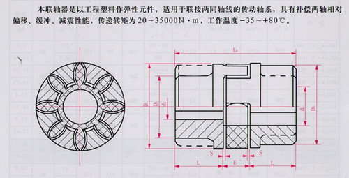本聯(lián)軸器是以工程塑料作彈性元件,適用于聯(lián)接兩同軸線的傳動(dòng)軸系,具有補(bǔ)償兩軸相對偏移、緩沖、減震性能,傳遞轉(zhuǎn)矩為20——35000N.m,工作溫度-35_+80℃